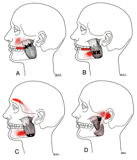 (A–D) Localization of Trigger Points (black crosses) of Masseter Muscle and areas of referred pain (red areas). Authorship: www.triggerpoints.net (Access date: 16 March 2021).