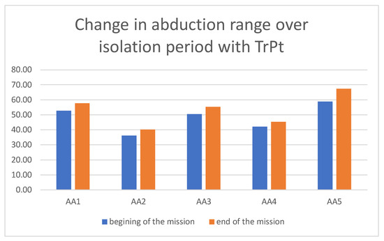 Statistical analysis showed significance in differences in mandibular abduction range at the beginning and end of the mission in AA who underwent TrPt (p < 0.05) (Table 4); however, differences in mandibular abduction range over the isolation period between both groups of AA did not show significance.