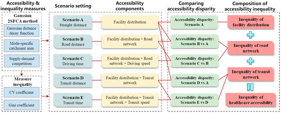 In this study, the spatial inequality in accessibility is understood and measured in terms of the disparity in accessibility across locations. The spatial inequality in healthcare accessibility might be caused mainly by two factors. The first factor is the distribution of facilities, which often mismatches with the distribution of the population to a certain extent. The second factor is the spatial configuration of multimodal transport networks, which would further reshape the spatial relationship between demanders and facilities. Furthermore, transport-related factors can be classified into transport network-related and travel time-related components. Enlightened by the approach to isolate the contribution of transport factor to individual-based accessibility developed by [39], this study proposes that the contributions of these factors to accessibility inequality can be separated by comparing various scenarios with different distance measures. Each scenario is related to a unique combination of accessibility components. Specifically, as shown in Figure 1, the following five scenarios are set up for analysis in this study.