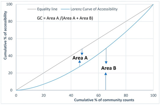 where and are the accessibility scores of units i and j, respectively, is the mean value of the accessibility scores across all units, and n is the number of units. Figure 2 shows an example of the Lorenz curve and the corresponding GC, where the Lorenz curve represents the cumulative distribution of accessibility across all units. Area A is the area between the Lorenz curve and the equality line, whereas Area B is the area below the Lorenz curve. In this example, GC can be calculated by dividing A by the sum of A and B.