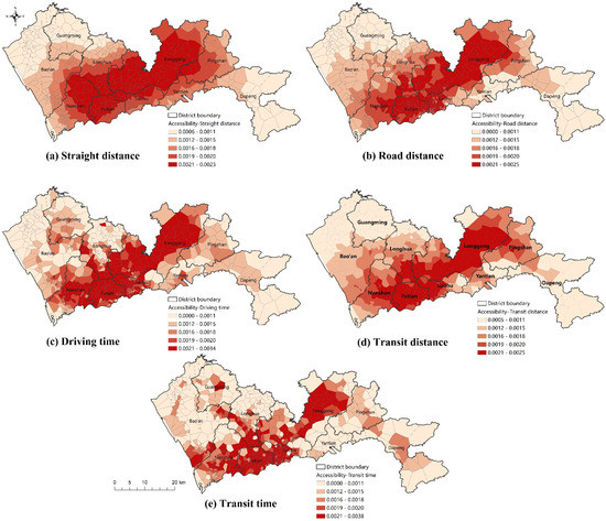 The distributions of facility- and transport-driven accessibility inequality for each mode can be visualized by comparing the accessibility in various scenarios. First, facility-driven accessibility inequality can be represented by the distribution of straight distance-based healthcare accessibility (Figure 5a). As demonstrated above, facility-related factors tend to facilitate healthcare accessibility along the Nanshan–Longgang corridor area, but lead to low accessibility in the western and eastern parts of Shenzhen.