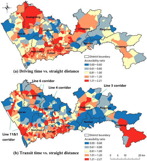 Third, the contribution of transport-driven accessibility inequality to the transit mode can be measured by the ratio of transit time-based accessibility (scenario E) to straight distance-based accessibility (scenario A). As shown in Figure 6b, large accessibility ratios appear in two types of areas. The first type is the central city (Futian, Luohu, and Nanshan districts), where the public transit network (especially metro) is the densest. The second type is the corridor areas along the major metro lines, e.g., the Line 11&1 corridor in Bao’an, the Line 6 corridor in Longhua, Bao’an, and Guangming, the Line 4 corridor in Longhua, and the Line 3 corridor in Longgang. This finding suggests that the public transit network, especially the metro network, significantly reshapes the pattern of healthcare accessibility.