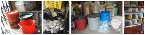 Food is sold in stores or on the street with poor hygiene, being kept without protection; pasta, grains, and cereals are stored in open containers and bags, where they are easily reached by insects and rats, and dairy and meat products are unrefrigerated (Figure 4). In no communities was there sanitary control by vendors, and inadequate hygiene was observed in the handling of food.
