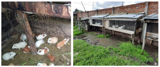 (a) Guinea pigs raised inside the house; (b) rabbits in aerial cages.