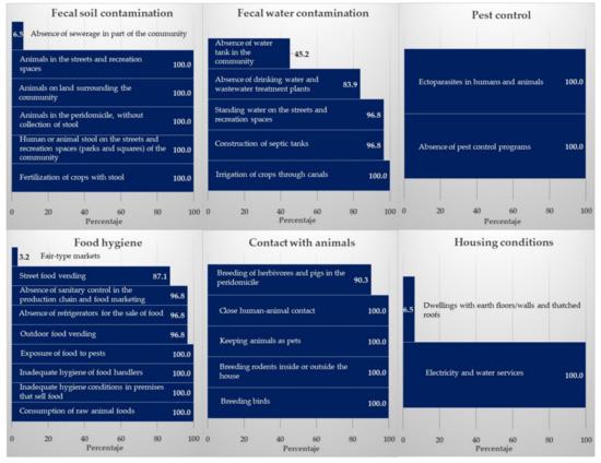 When performing the data analysis, the average levels of the risk factors were determined: soil fecal contamination (0.84 ± 0.042) and water (0.85 ± 0.106); absence of pest control (1 ± 0); inadequate food hygiene (0.87 ± 0.055); contact with animals (0.98 ± 0.073); and inadequate housing conditions (0.53 ± 0.105), with an overall arithmetic mean of 0.85 ± 0.069. These results indicate that the risk variables have an influence of 85% as a transmission risk index, demonstrating the critical hygienic situation of the area.