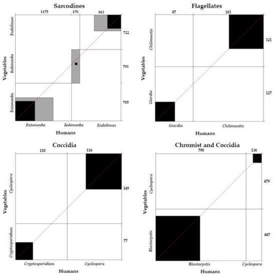 The comparative analysis of sarcodines (χ2 = 4.75; p = 0.3173), flagellates (χ2 = 0.014; p = 1), coccidia (χ2 = 0.018; p = 1), and chromists (χ2 = 1.10; p = 0.3068) between vegetables and humans showed that there were no significant differences between them. On the other hand, the sarcodines, flagellates, and coccidia found in vegetables and those diagnosed in humans were correlated.