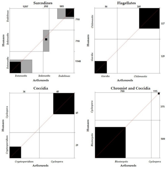 The comparative analysis of sarcodines (χ2 = 0; p = 1), flagellates (χ2 = 0.06; p = 0.8876), coccidia (χ2 = 0.024; p = 1), and chromists (χ2 = 25.14 p = 0.0005) in humans and arthropods showed that there were no significant differences between them. The sarcodines, flagellates, and coccidia found in arthropods and those diagnosed in humans were correlated.