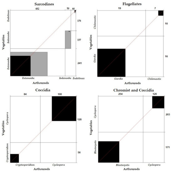 The comparative analysis of sarcodines (χ2 = 0; p = 1), flagellates (χ2 = 0.06; p = 0.8876), coccidia (χ2 = 0.024; p = 1), and chromists (χ2 = 0.41; p = 0.5837) in vegetables and arthropods showed that there were no significant differences between them. The sarcodines, flagellates, coccidia, and chromists found in vegetables and those detected in arthropods were correlated.