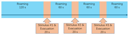 The participants were told to immerse themselves into the virtual context, and not to deliberately touch the idea that this was a virtual simulation. Before any stimuli were applied, the participants roamed the virtual train station for 2 min (henceforth referred to as ‘Roaming’). The purpose of the roaming period is to let the participants familiarise themselves with the environment, and to provide a baseline for the stimuli later on. The roaming period was subsequently followed by 3 stimulus-evacuation rounds. During each round, the participants experienced one specific stimulus and evacuated to the exit, which took approximately 20 s. They roamed the environment for 1 min after each stimulus-evacuation round, which served as a buffer. Figure 6 describes this procedure.