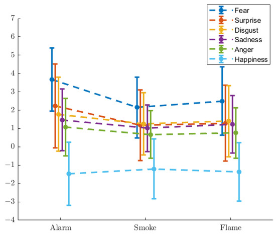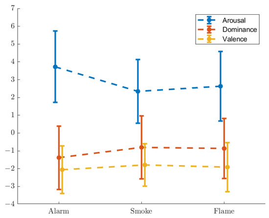 It is seen that arousal and dominance are more relevant in this study than valence. Similar to basic emotions, ‘Alarm’ causes the greatest shifts. No significant difference is detected between ‘Smoke’ and ‘Flame’ with respect to dominance, indicating that dominance reflects unawareness of situation mentioned in Section 3.1.
