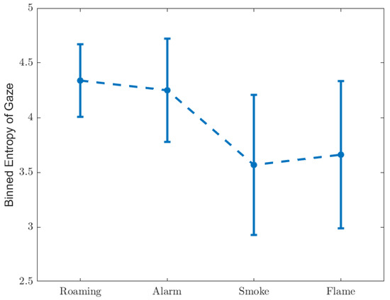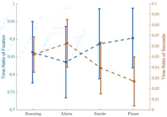 Compared to ‘Roaming’, ‘Alarm’ causes less fixation and more saccade, indicating that participants were spending longer searching around for clues. ‘Smoke’ and ‘Flame’, in the contrary, cause more fixation and less saccade, suggesting more attention being paid to the visual effects. Specially, the saccade ratio is even lower in the case of ‘Flame’ than ‘Smoke’, which could relate to the intensity of visual stimulation. No significant difference was found between the fixation ratios of ‘Flame’ and ‘Smoke’, however the p-value in this case is just on the edge of the threshold. Given that the boolean variables of fixation and saccade are in most cases opposite (or equivalently, a near-perfect negative correlation), we believe that the near-significant insignificance () could be due to random fluctuation, and hence that the time ratio of fixation actually has a relation with the intensity of visual stimulation.
