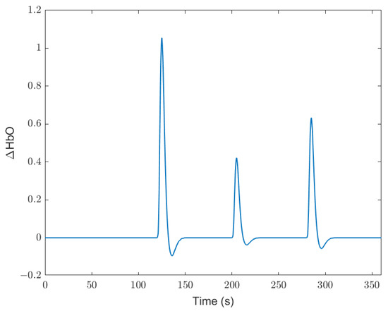 The goal here is to solve the activation coefficient , defined in Equation (10). It is clarified in Figure 6 that every adjacent two stimuli are set 80 s apart, whereas the HRF lasts 30 s. Therefore, every stimulus can be dealt with separately. Let denote an column vector that represents the signal of the j-th channel, where N denotes the number of time points. is exactly the same as in Equation (9), written as an column vector. represents the activation coefficient with respect to the i-th stimulus and the j-th channel. Equation (10) can hence be rewritten as the following equation, where denotes noise.