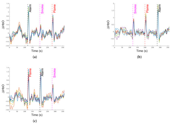 The signal, before further analysis, is fed through a 0.01–0.1 Hz bandpass filter to remove most physiological noise and slow-wave drift [56]. Figure 15 demonstrates three cases of filtered signals, where each of the curves corresponds to a separate channel.