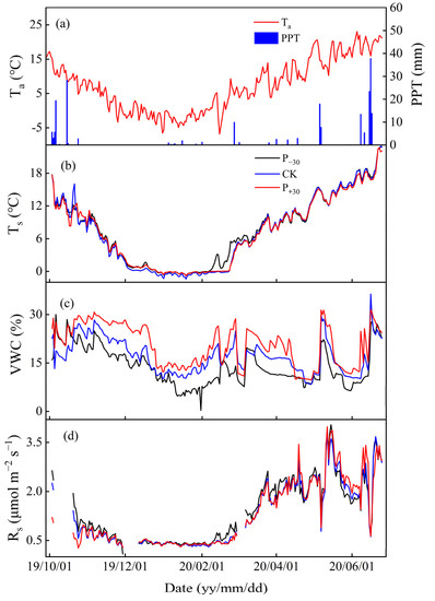 Changes in both the distribution and amount of precipitation have significant effects on soil CO2 emissions by regulating VWC; this is especially true in rain-fed agricultural areas, where precipitation is the primary driver of biological activity [26]. Generally, an increase in VWC will increase the aboveground and underground biomass, as well as substrate concentrations of plants [5,13], thereby enhancing Rs [14]. However, a previous study also found that a decrease in VWC increased Ts and then increased Rs [33]. In our study, the average Rs of the P−30 treatment was significantly higher than those of the CK and P+30 treatments during the whole growth period (Figure 2c, p < 0.05). This was mainly due to the variation between Ts and VWC in the different seasons and eventually led to the seasonal average Rs of the P−30 treatment being higher than those of other treatments [34]. For example, from January to March 2020, the VWC of the P−30 treatment was significantly lower than those of the other treatments and induced a significant increase in Ts (Figure 2a,b), while higher winter temperatures may promote microbial activity, resulting in a significant increase in Rs [35]. Therefore, the variation in the response of VWC and Ts to the precipitation in different seasons may be the main reasons for the differing responses of Rs to VWC [34].