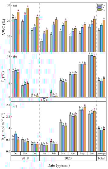 The soil temperature (Ts) exhibited the same temporal pattern as air temperature, and the mean air temperature was 7.43 °C during the winter wheat whole growth period (Figure 1a,b and Figure 2b). The highest and lowest monthly mean Ts values occurred in Jun (P−30 treatment, 18.64 °C) and Jan 2020 (CK treatment, −0.62 °C), respectively. The Ts in the different precipitation treatments showed very similar seasonal variations. The average Ts was highest in P+30 treatment (8.19 °C), which was 13.9% and 7.2% higher than those in the CK and P−30 treatments (p < 0.05), respectively (Figure 2b). The variation in VWC was controlled mostly by precipitation events, and the total precipitation was 214.3 mm during the winter wheat whole growth period (Figure 1a,c). There were significant differences in the average VWC throughout the growth period, and the highest VWC, observed in the P+30 treatment, was 20.50%, which was 16.6% and 32.5% higher than those in the CK and P−30 treatments (p < 0.05), respectively (Figure 2a).