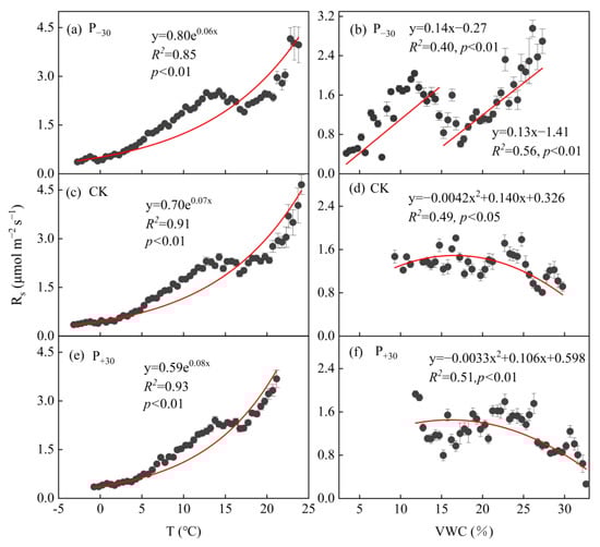The Rs was fitted to Ts and VWC with empirical exponential and quadratic functions [10,13], respectively: