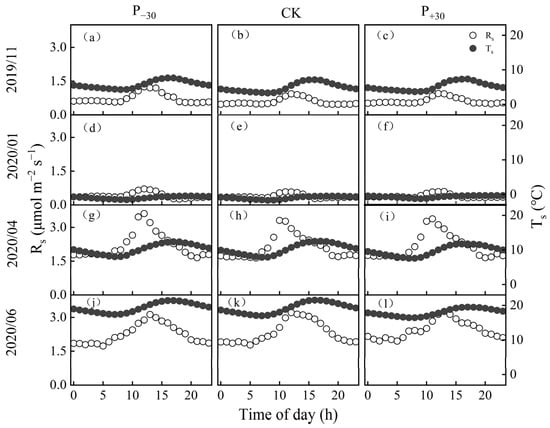 Mean monthly diel cycles of soil respiration (Rs, open points) and soil temperature (Ts, solid points) at a depth of 10 cm in November 2019 (a–c) and January (d–f), April (g–i), and June (j–l) 2020.
