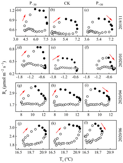 Mean monthly diel cycles of soil respiration (Rs) and soil temperature (Ts) at a depth of 10 cm in November 2019 (a–c) and January (d–f), April (g–i), and June (j–l) 2020. The number of solid points and the arrow indicate the monthly average diurnal dynamic lag time between Rs and Ts and the direction of the diel cycle, respectively.