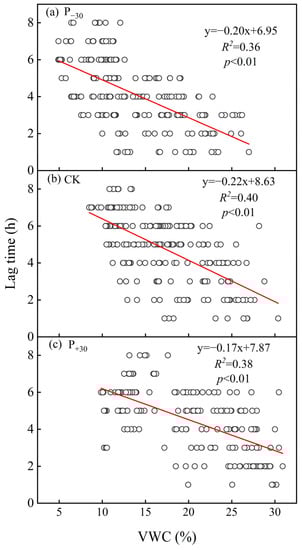 Relationship between soil volumetric water content (VWC) and lag time in three precipitation treatments (P−30 (a), CK (b) and P+30 (c)) and VWC at 10 cm soil depth. The lag times were calculated by a cross-correlation analysis using a three-day moving window with a one-day step. The solid line is fitted using linear regression.