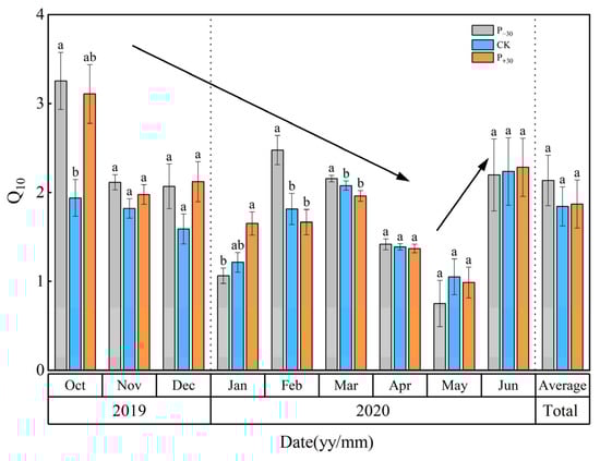 The ranges of monthly Q10 under the P−30, CK, and P+30 treatments were 0.75–3.25, 1.05–2.08, and 0.99–3.11 during the whole growth period, respectively (Figure 7). The seasonal difference in Q10 (from 1.84 to 2.14) was not significant (p > 0.05, Figure 7). The monthly Q10 decreased at first and then increased, and the lowest values (in May 2020) were 0.75, 1.05, and 0.99 in P−30, CK, and P+30 treatments, respectively.