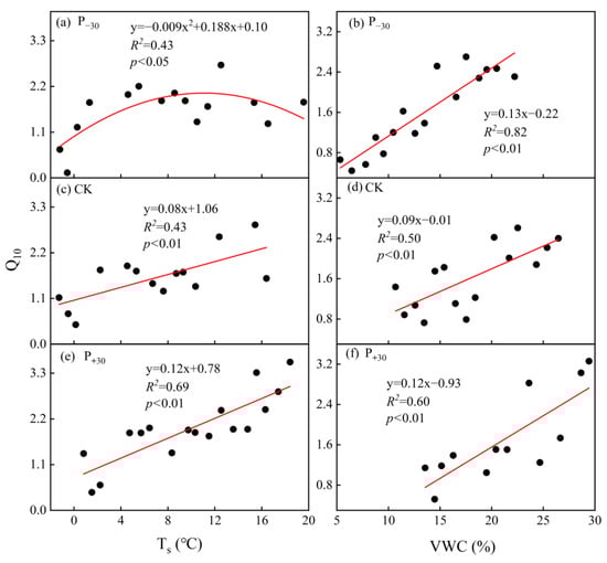Relationships between seasonal soil temperature (Ts), soil volumetric water content (VWC), and Q10 in the different precipitation treatments during the winter wheat whole growth period. The red lines indicates the significant relationship between Q10 and Ts (a,c,e) or VWC (b,d,f).