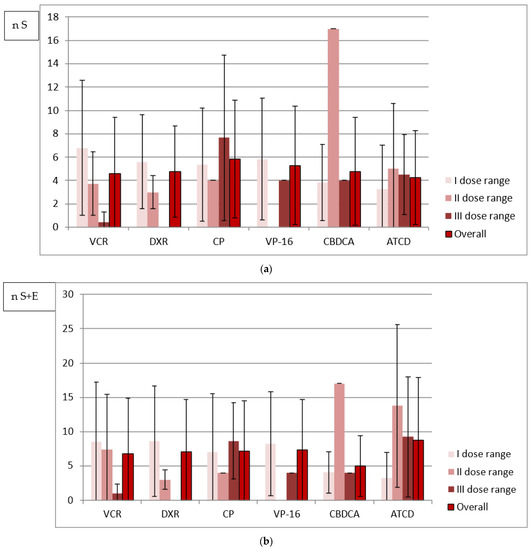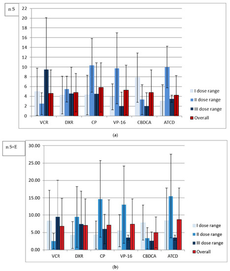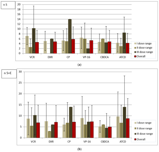 (a) Mean number of size abnormalities (n S) in relation to three weekly dose ranges of analyzed drugs. (b) Mean number of all abnormalities (n S + E) in relation to three weekly dose ranges of analyzed drugs.