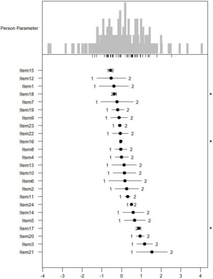 Person-item map for the person parameter and item parameter distribution of the 24 Paradise items having response categories (1 = none, 2 = mild to moderate, and 3 = severe to extreme PSDs). * Disordered thresholds are flagged by means of a ‘*’ in the margin of the figures.