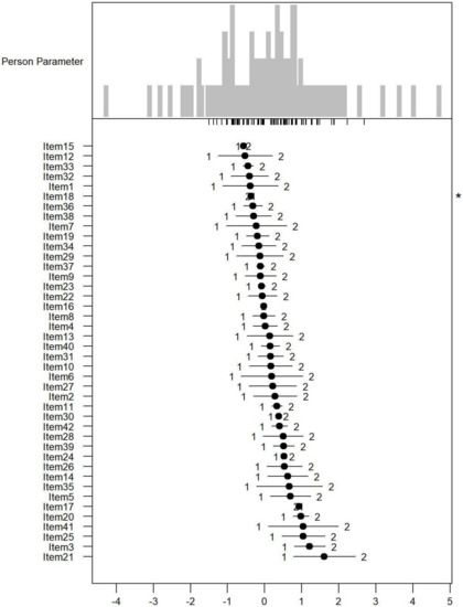 Person-item map for the person parameter and item parameter distribution of the Paradise and Eden items combined having three response categories (1 = none, 2 = mild to moderate, and 3 = severe to extreme PSDs). * Disordered thresholds are flagged by means of a ‘*’ in the margin of the figures.