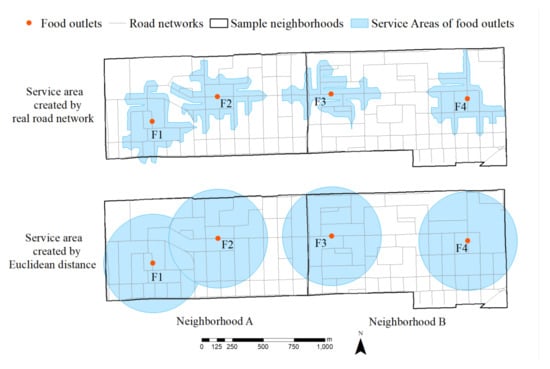 Following previous studies on identifying different types of food environments (e.g., [,]), this study uses the service area method to measure geographic access to healthy and unhealthy food outlets. A service area is a geographic area that includes all households that a specific food store can serve. In other words, all houses located in a service area can easily access the associated store for grocery shopping or dining. A simple illustration of the service area is presented in Figure 1. This study randomly selected two adjacent neighborhoods A and B from the study area. Both Neighborhoods A and B have two food stores, F1 and F2, and F3 and F4. In the upper panel, the blue zones around each store represent the service area defined using a road network distance of 400-m. It is clear from Figure 1 that although Neighborhood A has only two stores within the border, its residents along the edge (with Neighborhood B) can also shop from Food Store 3 in Neighborhood B. If this study only counts the number of stores, this edge effect will be ignored, thus underestimating the food environment in Neighborhood A. In the empirical analysis, this study uses road network distances instead of straight-line (Euclidean) distances, as many existing works do. To show the difference between the road network and the straight-line distances, a straight-line case is presented in the lower panel of Figure 1. The straight-line approach overestimates the serviceable areas and distorts the actual traveling distance.