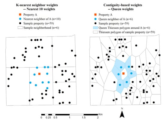 where P is an vector of the housing prices, and represent the constant term and the associated coefficient, is the spatial autoregressive coefficient, W is an spatial weights matrix. This study considers both the k-nearest criterion (k = 5, 10) and the contiguity-based queen criterion to determine neighbor relationships. Figure 2 illustrates the neighbor definitions based on the two weights matrices. The term WP represents the weighted average of the housing prices from neighboring locations. The is an matrix of observations on explanatory variables as defined in the previous subsection, is a vector that represents parameters of explanatory variables, and is an vector of independent and identically distributed error terms.