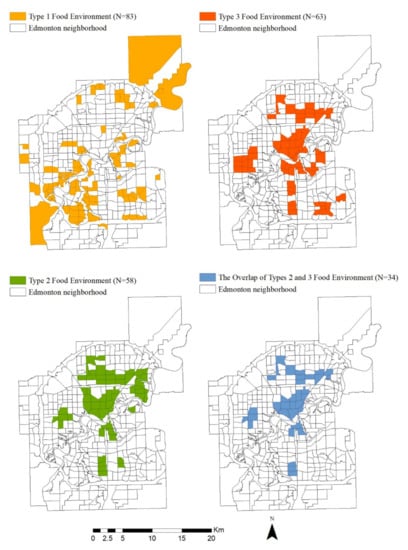 To identify the food environments in Edmonton, this study first follows previous studies (e.g., [,]) and adopts 1000-m (around 10–15 min walk) as the threshold to create service areas around each food outlet. Then, this study counts the food service areas for each neighborhood and defines three types of food environments based on the corresponding service-area counts. In particular, this study identifies type 1 food environment as neighborhoods with less than two service areas of supermarkets and grocery stores. This type of food environment represents neighborhoods in the bottom quantile of access to supermarkets and grocery stores and is similar to the concept of food desert. Similarly, this study identifies type 2 food environment as neighborhoods with more than four (i.e., the top quantile of) service areas of supermarkets and grocery stores. The type 2 environment is relevant to the concept of food oasis in the literature, indicating that communities have superior access to healthy food stores. Finally, this study labels type 3 food environment as neighborhoods with more than 23 (i.e., the top quantile of) service areas of fast-food restaurants and convenience stores. The type 3 food environment is relevant to the definition of food swamp in the literature, which means that these communities have too much exposure (i.e., been swamped) to unhealthy food retailers. Note that this study defines the food environments solely based on the access to different types of food stores. The literature, the definitions of food deserts, food swamps, and food oases usually also involve imposing relevant socioeconomic criteria, such as low income and high population density. This study takes such socioeconomic characteristics as control variables in the modeling procedure.