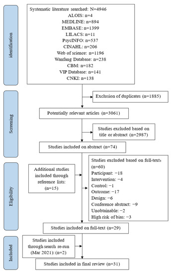 The study selection process is presented in Figure 1. A total of 4946 potentially relevant citations were identified from 11 databases and imported to Endnote X7. Totally 1885 duplicate articles were excluded in the first step. After screening the titles and abstracts, 2987 articles were excluded. In all 60 articles were excluded after quality appraisal and reading the full text. Fifteen relevant articles were included by manual exploration of the reference lists of the included studies. We searched the databases again on 8 March 2021, and updated two studies. Finally, 31 studies published between 2000 and 2020 were included, 24 in English and the rest in Chinese.