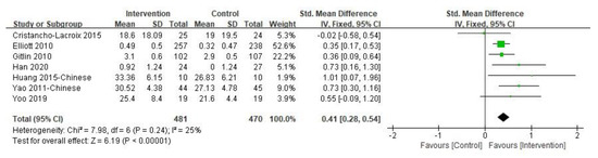 All statistical analyses were conducted using Revman Version 5.3 when the mean and standard deviation of the outcome data were reported or calculated. Otherwise, studies were described narratively. Considering that the outcomes of the included studies were measured using different scales and that many combinations of multi-component interventions were included for review, the standardized mean difference (SMD) and 95% confidence interval (95% CI) between the scores of the two groups immediately after the intervention were calculated to estimate the overall intervention effect [29].