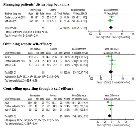 Five studies reported the effects of multi-component interventions on caregiver self-efficacy analysis. It is important to note that Duggleby et al. [43] and Possin et al. [19] used the General Self-efficacy Scale (GSES) and the Care Ecosystem Caregiver Self-efficacy Scale to assess participants’ perceived self-efficacy, respectively. Both studies found no significant improvement in self-efficacy. The other three studies [22,42,44] used the Revised Scale for Caregiving Self-efficacy (RSCSE) to measure self-efficacy in three dimensions: managing patients’ disturbing behaviors, obtaining respite and controlling upsetting thoughts. The results reported that multi-component interventions had no significant impact on the three dimensions of caregiver self-efficacy (Figure 3).