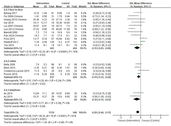 We pooled seven studies evaluating the effects of multi-component interventions on the anxiety of informal caregivers (Figure S2). Overall, the effect was statistically significantly different between the intervention and control groups [SMD = −0.53, 95% CI (−0.78, −0.27), p < 0.001, I2 = 48%]. Sensitivity analysis was performed by omitting one study in each round and the results did not change. However, no significant difference was detected between studies using face-to-face and online delivery methods (p = 0.35), although the only study which used online intervention, reported a much larger effect [21] (Table S4). Three highly heterogeneous (I2 = 98%) studies reported anxiety outcomes for the third month after the intervention, but no statistically significant difference was found.