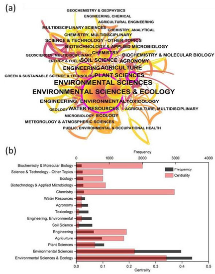 The co-occurrence analysis of subject categories can reveal their inter-disciplinary links and intrinsic connections [29,30]. Figure 2 shows the co-occurrence network of a subject category (Figure 2a) and the top 15 categories in terms of frequency and centrality (Figure 2b). In Figure 2a, each node represents a different subject category; the purple ring indicates the high centrality values of the corresponding categories, and the lines between the nodes demonstrate the co-occurrence of these subject categories. As shown in Figure 2a, “environmental sciences and ecology” (citation counts 3503), “environmental sciences” (3173), “plant sciences” (835), “agriculture” (771), and “engineering” (525) were the five most popular categories of research. In Figure 2b, the centrality of “chemistry” (0.37) was the largest, followed by “environmental sciences and ecology” (0.34), indicating that these two categories had a greater influence on the phytoremediation of cadmium-contaminated soil. The frequency of “environmental sciences and ecology” (3503) is larger than that of “chemistry” (232), but in terms of centrality, “environmental sciences and ecology” (0.34) is lower than “chemistry” (0.37). This indicated that the category with the highest visibility will not always be accompanied by the greatest influence [31].