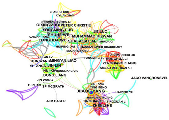 The author cooperation analysis revealed the contribution of an author and the cooperative relationship between different authors. The author cooperation network is presented in Figure 3, where each node represents an author, and the node size are proportional to the publication number of the author. The links between the nodes suggested a cooperative relationship between these authors. The top ten authors for the number of publications are listed in Table 1. The most active author in this field was Xiaoe Yang (72 publications), followed by Shuhe Wei (42 publications), Longhua Wu (41 publications), and Shafaqa Ali (41 publications). These authors have made significant contributions to this field. Yang et al. revealed that Sedum alfredii, could hyperaccumulate cadmium and lead; in addition, they conducted extensive studies on the enrichment mechanism and successfully applied it in phytoremediation [13,32,33]. Shuhe Wei conducted several studies in screening new cadmium hyperaccumulators and actively applied them in phytoremediation [9,34,35]. Longhua Wu found that Sedum plumbizincicola had a strong ability to absorb cadmium from soil, and made serious progress in soil remediation and intercropping [36,37,38]. Shafaqa Ali conducted significant research on cadmium phytoextraction enhancement, cadmium phytoavailability reduction, and translocation of metals from soil to wheat [39,40,41]. There was a weak cluster connection between the research (Figure 3), which means that the authors tended to cooperate in relatively small-scale teams. Hence, more cooperation across international teams is required in future studies.