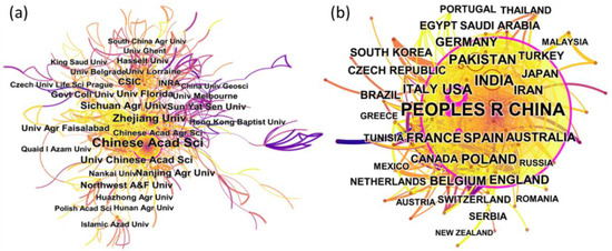The cooperation network can reveal the academic influence of the institution and country to a certain extent. Most contributing institutions are from China, the USA, Pakistan, France, Spain and Belgium. There were 8 Chinese institutions in the top 15 institutions in terms of the number of articles published. France and Pakistan had two institutions each in the top institutions. The remaining three were from the USA, Spain, and Belgium. Among these institutions, the Chinese Academy of Sciences (439 articles) and Zhejiang University (163 articles) made a significant contribution to cadmium hyperaccumulator. The University of Chinese Academy of Sciences (108), Sichuan Agricultural University (107 articles), and University of Florida (88) also conducted research in this field. From the cooperation network of institutions (Figure 4a), we observed relatively close cooperation among several institutions. For example, the Chinese Academy of Sciences, Zhejiang University, and the University of Florida had close cooperation with others, while other institutions also cooperated closely.