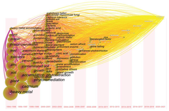 As shown in Table 4, “heavy metal” (3050 times), “cadmium” (2747 times), “phytoremediation” (1886 times), “accumulation” (1707 times), and “zinc” (1492 times) were the most frequent keywords. Some scholars have pointed out that using hyperaccumulators to remove HM from soils was a novel strategy [46,47,95]. Thereafter, scholars have conducted extensive studies to explore the hyperaccumulation mechanism of hyperaccumulators based on cytology, molecular biology, and genetics [14,15,16]. van der Ent et al. [21] outlined the main considerations for establishing the metal or metalloid hyperaccumulation status of plants, (re)defined some of the terminology, and identified potential hazards. These studies have provided standard terminology and methods for hyperaccumulators. Molecular tools have been developed to improve the understanding of the mechanisms by which plants absorb, transport, isolate, and tolerate metals [96,97,98]. Overall, phytoremediation is considered a cost-effective, efficient, novel, and eco-friendly technology, which remains an active field of current research [20,99].