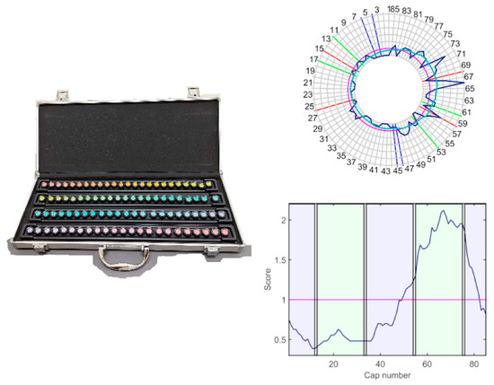 (Left) the Farnsworth–Munsell 100 hue test. (Right) example of the standard result diagram, showing the original Farnsworth plot (top, blue line), its low-pass-filtered version (top, cyan line), and the Dain–Birch (DB) plot (bottom). The coloured sections of the DB plot represent which caps are sorted according to RG (green) and BY (bluish) mechanisms. The magenta line is the patient’s normalised mean score. The example shows general discrimination losses that are worse for the red-green mechanism.