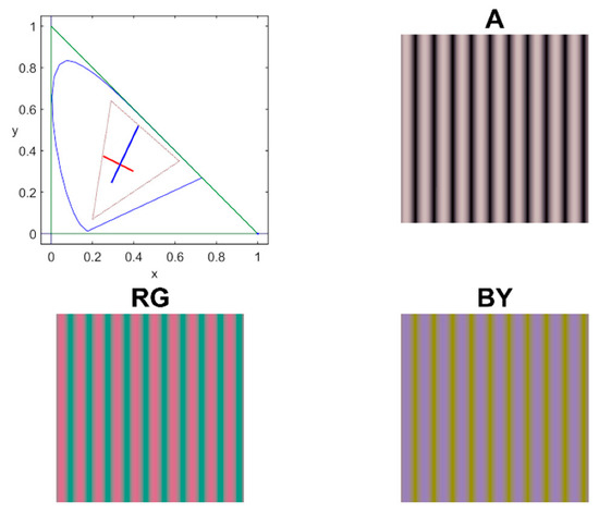 Example of the achromatic (A), red-green (RG), and blue-yellow (BY) sinusoidal patterns used in the CSF measurement. The chromaticity diagram shows the colour palette for the RG (red line) and BY (blue line) with maximum amplitude.