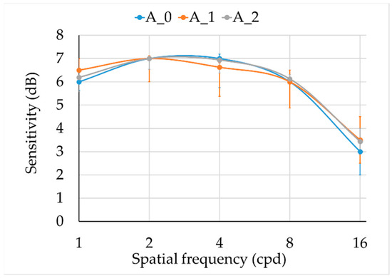 Achromatic monocular CSF. Median and interquartile range for three groups: A_0 = controls (blue), A_1 = moderated smokers (orange), and A_2 = severe smokers (grey).