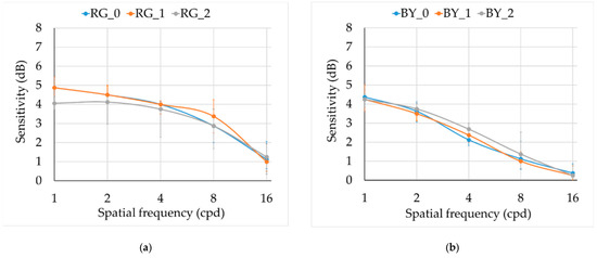 Chromatic monocular CSFs. Median and interquartile range for three groups: 0 = control (blue), 1 = moderated smokers (orange), and 2 = severe smokers (grey): (a) RG mechanism, (b) BY mechanism.