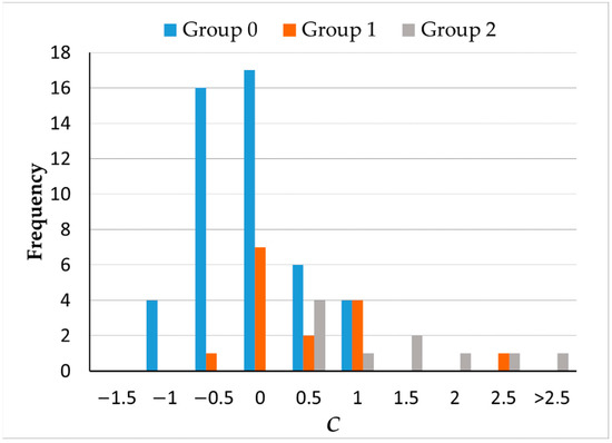 Distributions of principal component C for three groups: 0 = controls (blue), 1 = moderated smokers (orange), and 2 = severe smokers (grey).