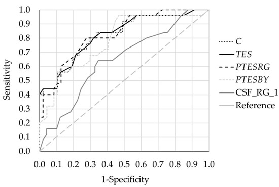 Finally, to analyse the diagnostic power of the different perceptual parameters, we calculated the receiver operating characteristics (ROC) curves. We compared group 0 (negative) with groups 1 and 2 together (positive), and the results are described in Figure 7 and Table 4. The data extracted from the curves are the area under the curve, specificity, and cutoff value for 80% of sensitivity and sensitivity and cutoff value for 80% specificity. If we consider these data, the best perceptual parameter is PTESRG, since it had the best specificity and sensibility, with a cutoff value between 29.5 and 32, although component C and TES had similar results.