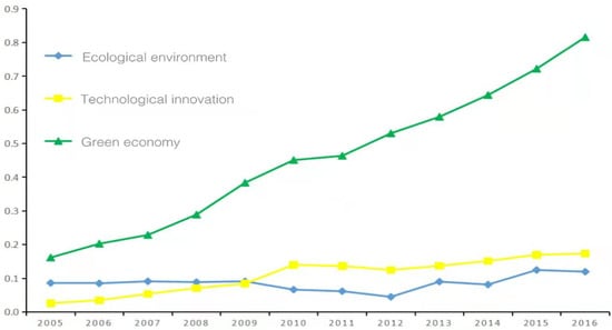 Combining Table 3, Table 4 and Table 5, it can be seen that from 2005 to 2016, the comprehensive development levels of ecological environment, technological innovation, and green economy in China achieved various degrees of improvement as a whole. The average annual comprehensive development level of ecological environment increased from 0.09 to 0.12, increasing by 133.3%. The development level of technological innovation increased from 0.03 to 0.17, with a huge growth rate of 566.7%. The average annual comprehensive development level of green economy increased from 0.16 to 0.82, and the growth rate also reached an alarming 512.5%. It can be seen that from 2005 to 2016, the comprehensive development level of the green economy improved the most, the development level of and technological innovation was second, and the comprehensive development level of the ecological environment improved the least. This shows that China has indeed achieved great success in transforming its development model and moving towards high-quality development. China’s green economy development trend has achieved good results. China has always paid attention to the country’s technological innovation capabilities, and has achieved good results by continuously supporting the development of high-tech industries. Although the development of the ecological environment has also been improved, it has not achieved the obvious effect, China still needs to invest more in ecological and environmental protection.