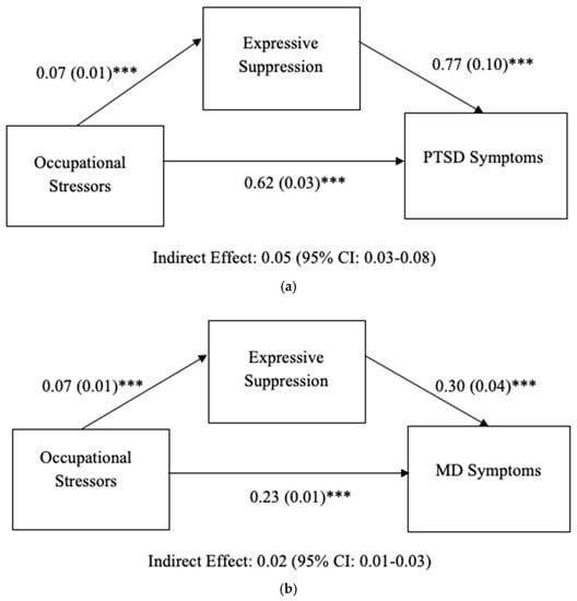 MD symptoms.Figure 1b illustrates findings from the occupational stressors model and MD symptoms. It was found that first responders who reported a greater number of occupational stressors also showed significant positive associations with expressive suppression (B = 0.07, SE = 0.01, p < 0.001). Participants who experienced more occupational stressors also reported significantly greater MD symptoms (B = 0.23, SE = 0.01, p < 0.001) with the inclusion of expressive suppression in the model. Higher expressive suppression was associated with significantly higher MD symptoms (B = 0.30, SE = 0.04, p < 0.001). The 95% confidence interval for the indirect effect of occupational stressors on MD symptoms via expressive suppression did not include zero, indicating statistical significance (B = 0.02, 95% CI: 0.01, 0.03).