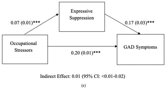 (a) Results of mediation model predicting PTSD. Analysis controlled for demographic (age, gender) and work-related (first response type, department, area, employment status, agency) variables. Occupational Stressors, Expressive Suppression, PTSD: Posttraumatic Stress Disorder. (b) Results of mediation model predicting MD. Analysis controlled for demographic (age, gender) and work-related (first response type, department, area, employment status, agency) variables. Occupational Stressors, Expressive Suppression, MD = Major Depression. (c) Results of mediation model predicting GAD. Analysis controlled for demographic (age, gender) and work-related (first response type, department, area, employment status, agency) variables. Occupational Stressors, Expressive Suppression, GAD: Generalized Anxiety Disorder. Unstandardized regression coefficients (B) are listed. *** p < 0.001.