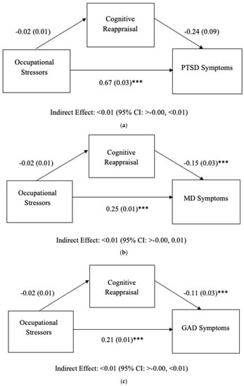 (a) Results of mediation model predicting PTSD. Analysis controlled for demographic (age, gender) and work-related (first response type, department, area, employment status, agency) variables. Occupational Stressors, Cognitive Reappraisal, PTSD: Posttraumatic Stress Disorder. (b) Results of mediation model predicting MD. Analysis controlled for demographic (age, gender) and work-related (first response type, department, area, employment status, agency) variables. Occupational Stressors, Cognitive Reappraisal, MD: Major Depression. (c) Results of mediation model predicting GAD. Analysis controlled for demographic (age, gender) and work-related (first response type, department, area, employment status, agency) variables. Occupational Stressors, Cognitive Reappraisal, GAD: Generalized Anxiety Disorder. Unstandardized regression coefficients (B) are listed. *** p < 0.001.