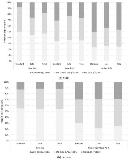 Proportion of male and female participants according to BAC (g/100 mL) by AUDIT-C score (lower risk, hazardous, active AUD) and preferred bar type (standard vs. late).